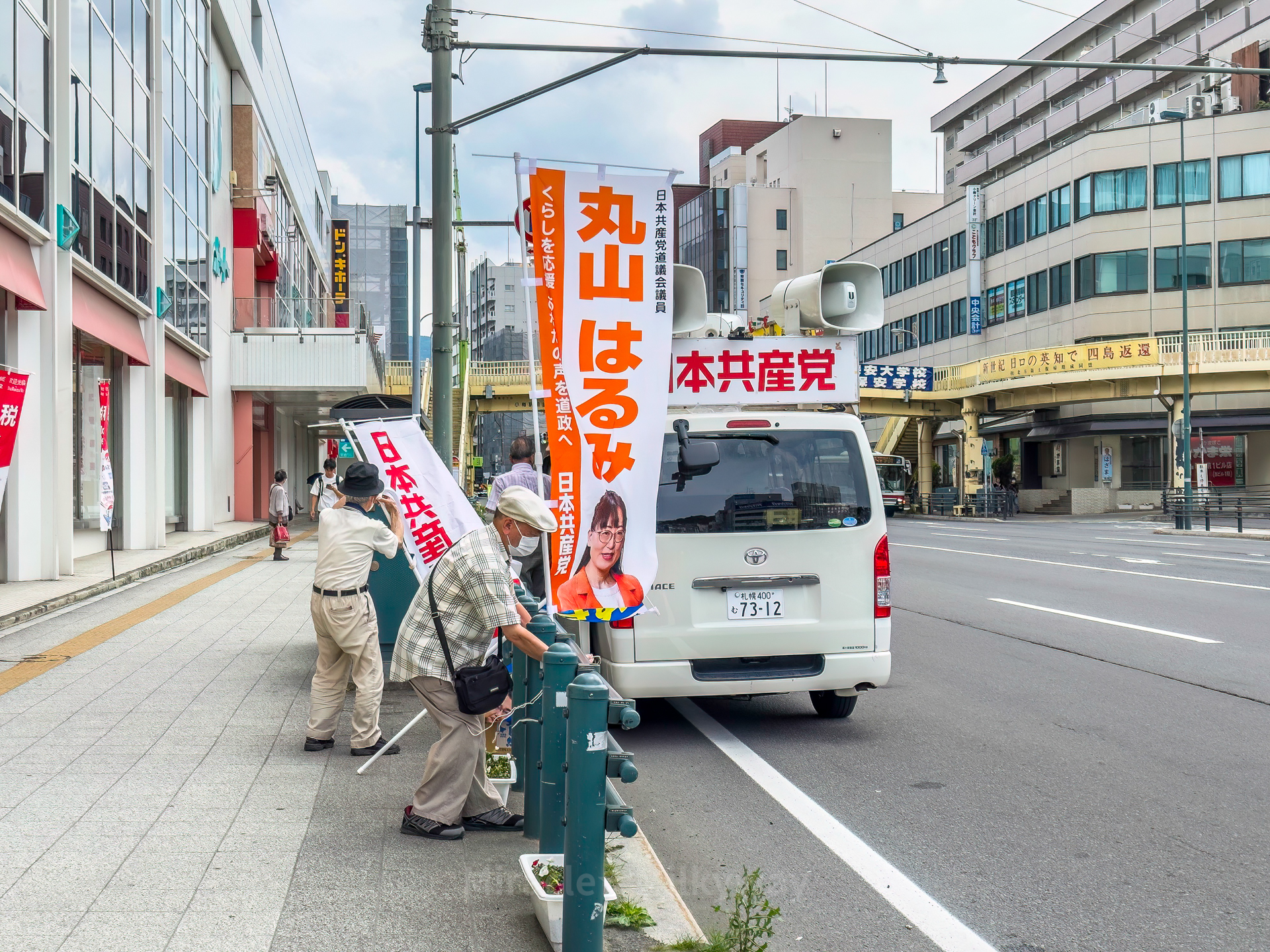 역 앞 사거리에 연설을 준비하고 있는 일본공산당 마루야마 하루미 의원