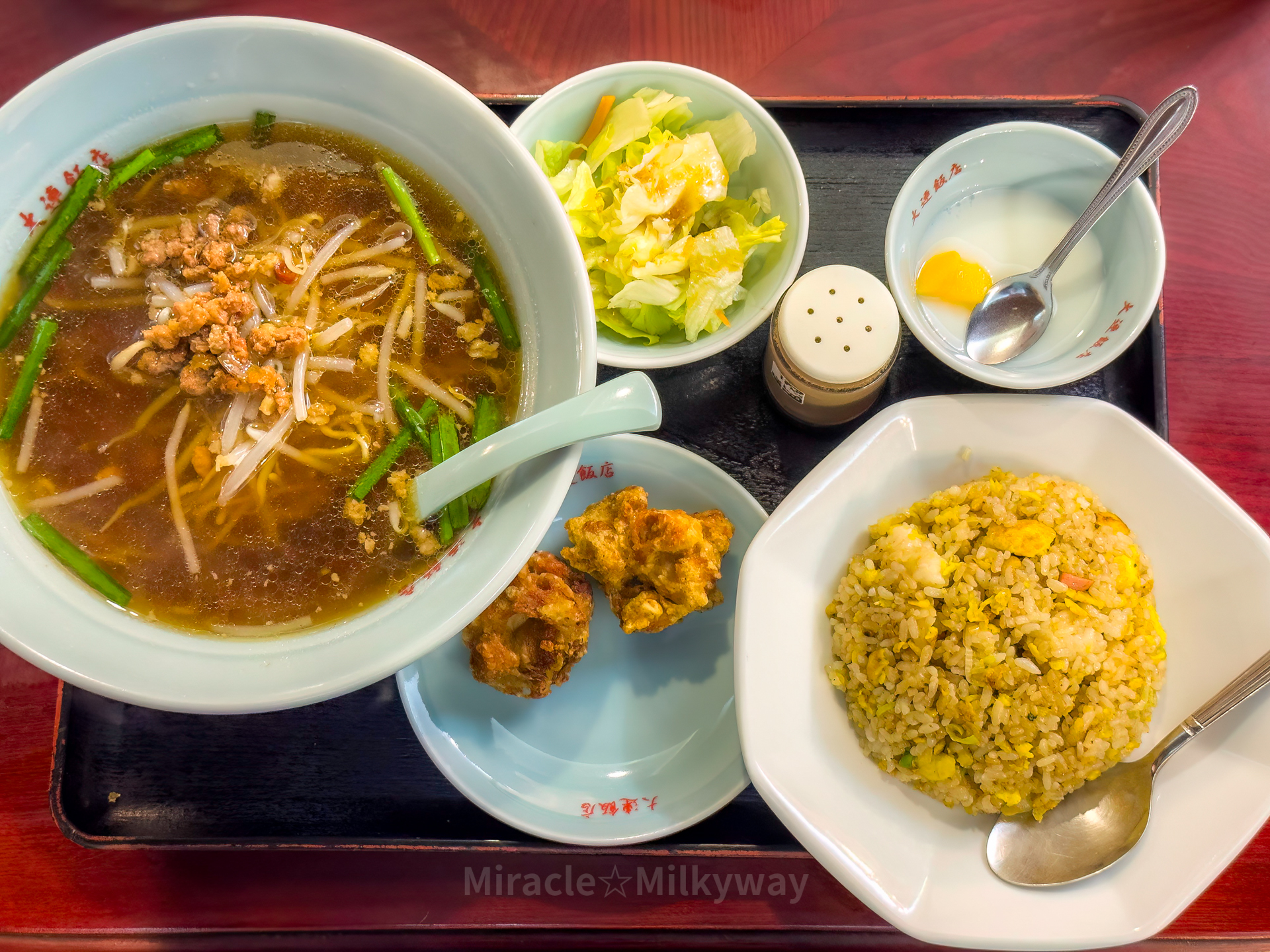 타이완 라멘과 볶음밥을 같이 먹는 세트가 있어서 그걸로 주문. 타이완 라멘은 고추와 부추가 들어가 정말 개운하고 깔끔해서 기름진 볶음밥과 같이 먹기 매우 환상의 궁합이었다