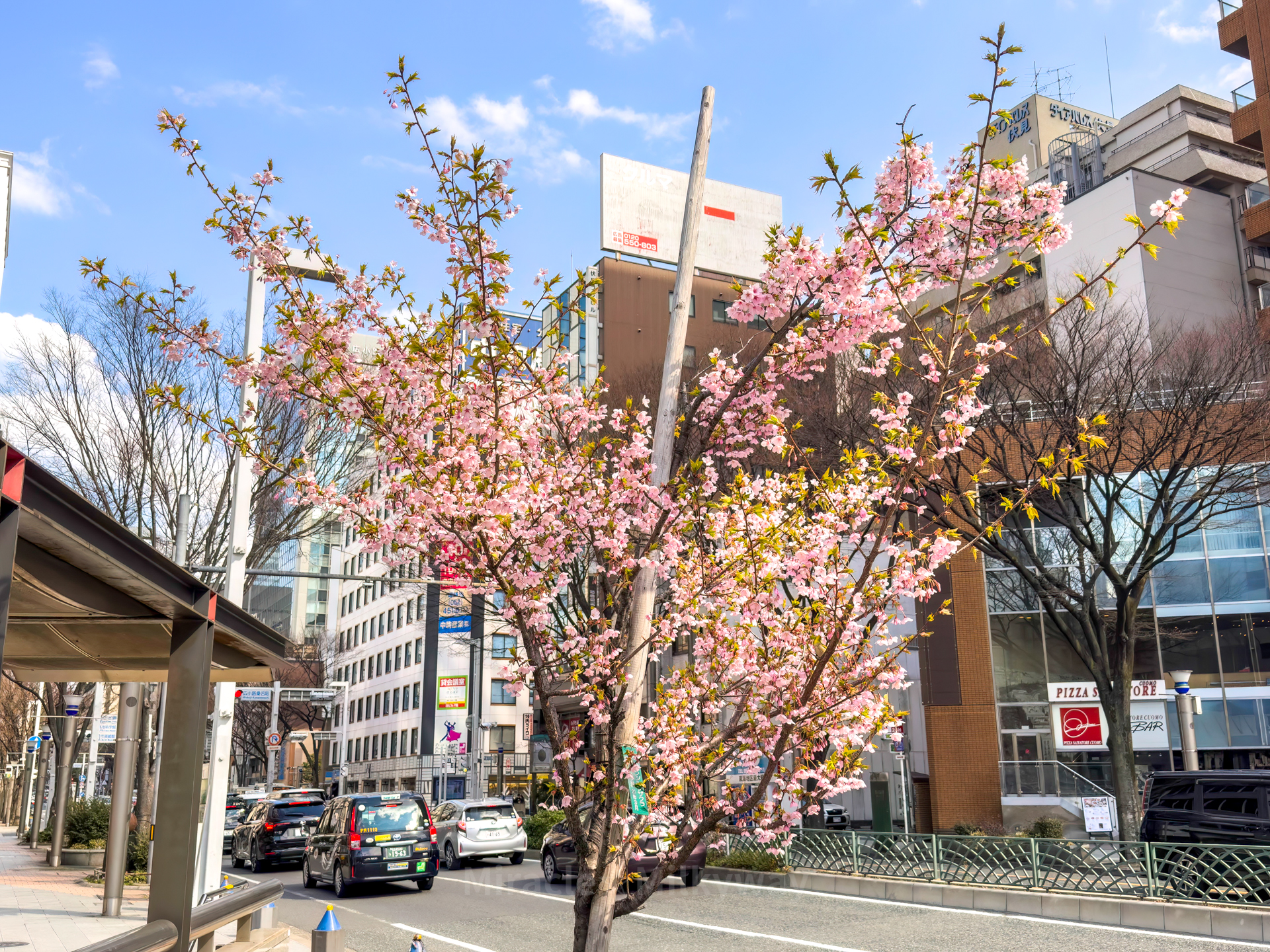 호텔이 있는 후시미역 출구 앞. 공식 개화일은 3월 30일이었는데, 벌써 진한 분홍색의 벚꽃이 만개하기 시작했다.