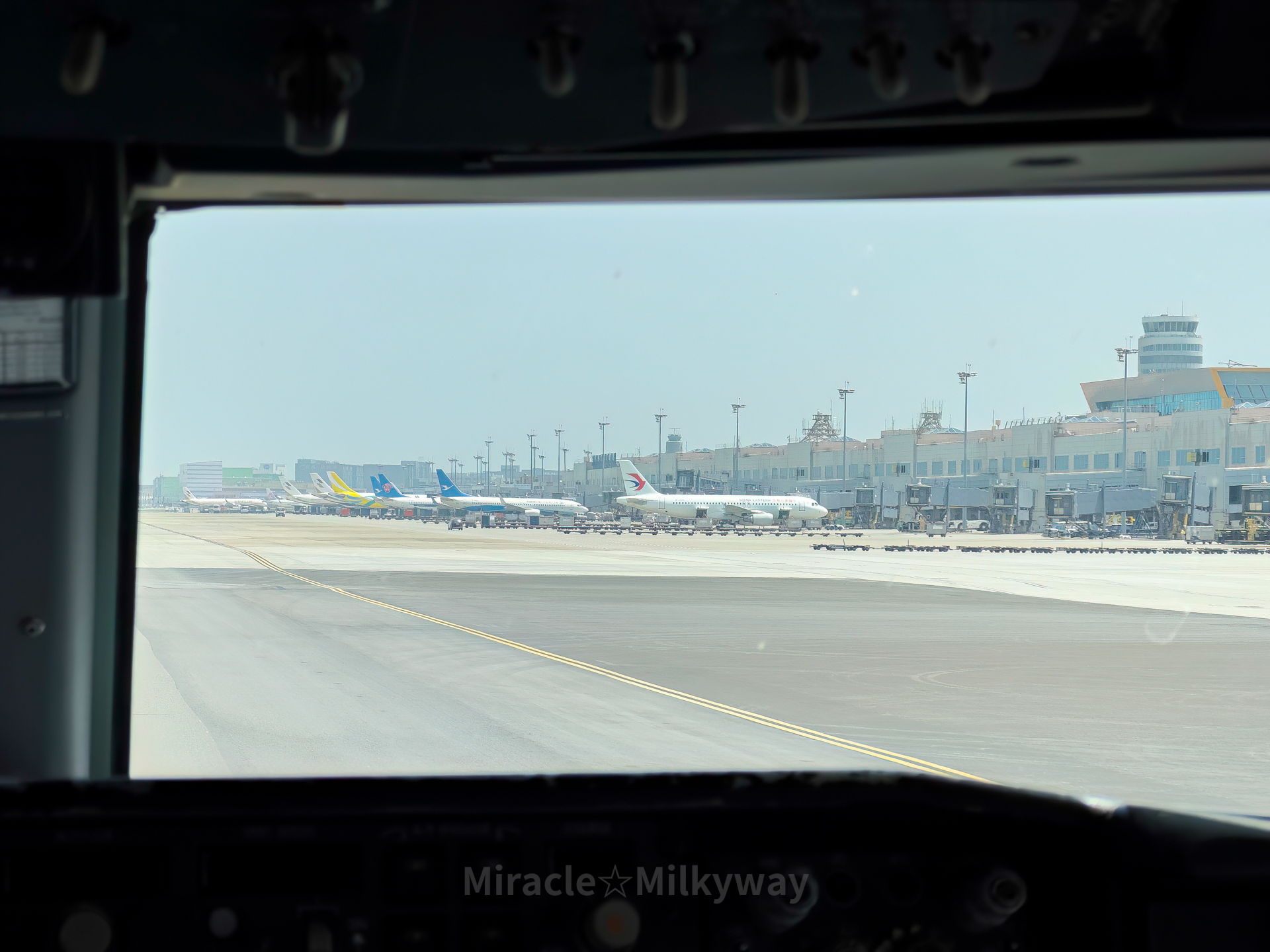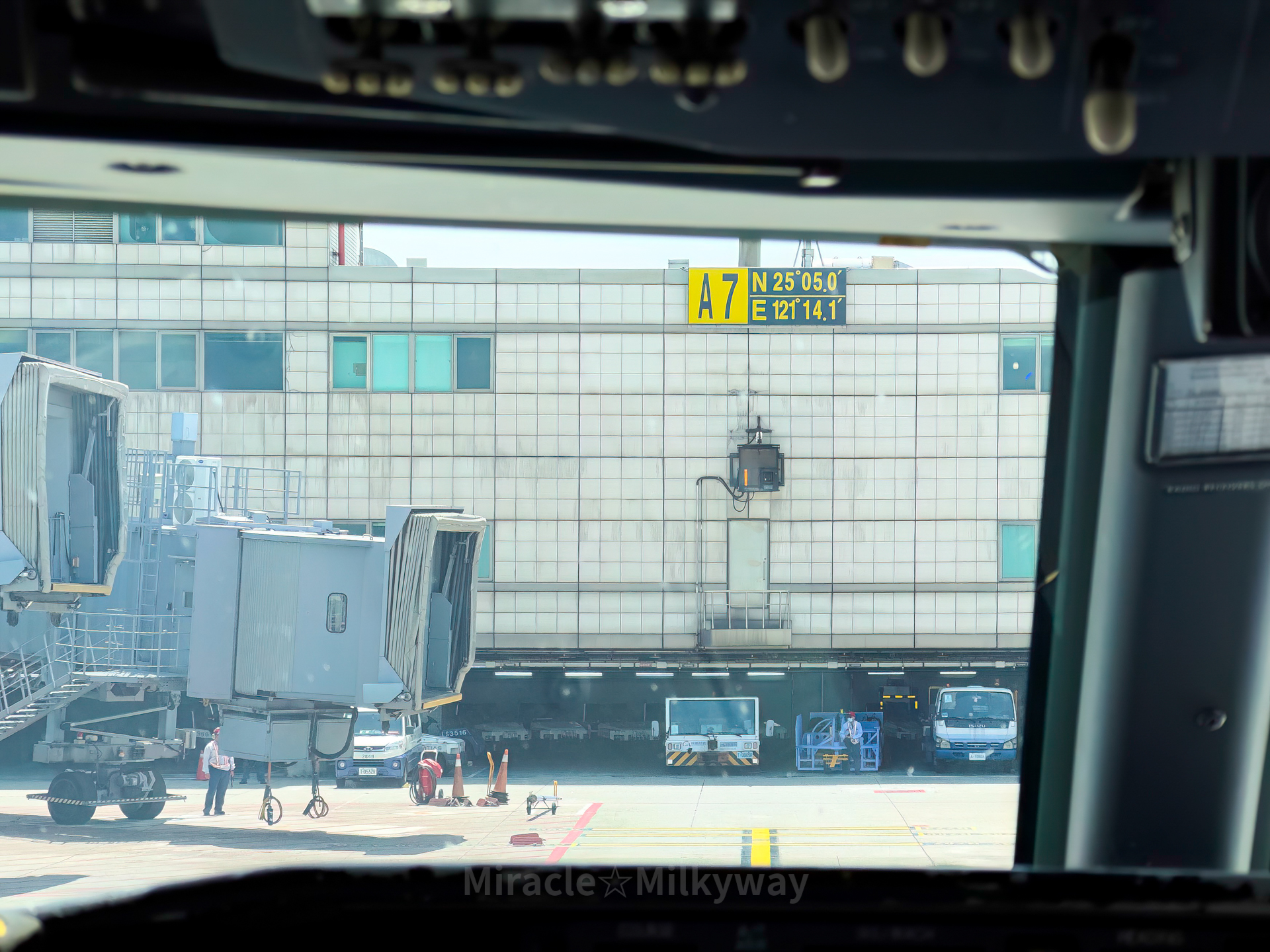 2시간 살짝 안되는 비행 끝에 도착한 타이페이. 들어가야 할 게이트에 세부퍼시픽(멀리 노란색 꾸리) 항공기가 아직 램프아웃을 하지 않아, 해당 항공기가 나올 때까지 기다리는 중이다.