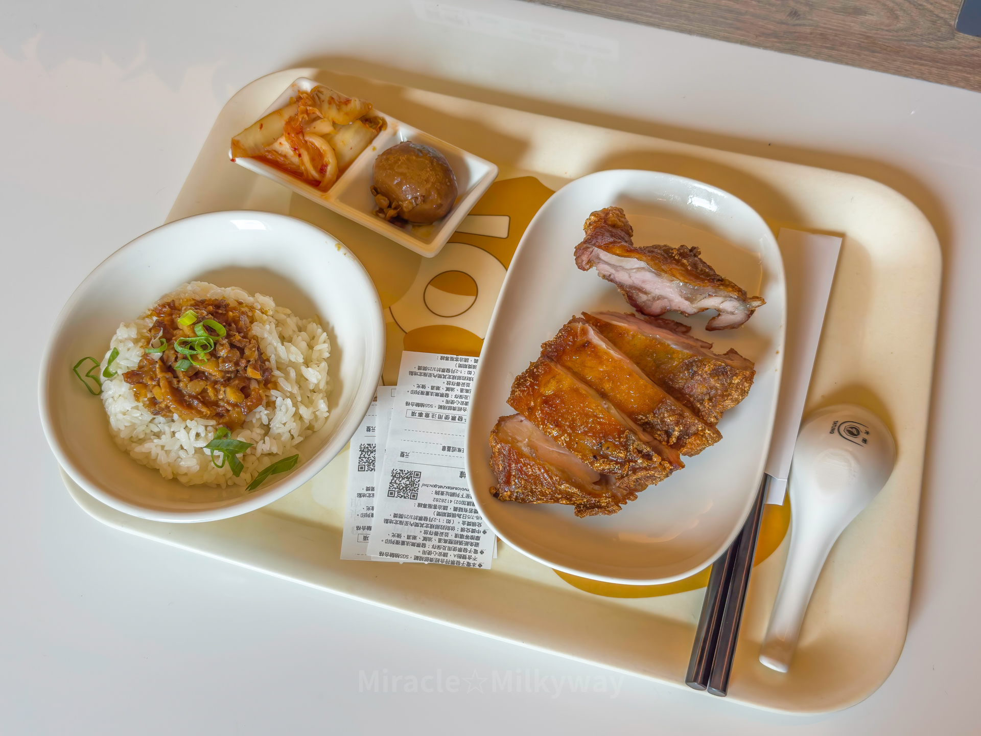 공항 푸드코트에서 아침 겸 점심. 닭고기 튀김과 돼지고기 향신료 소스가 올라간 밥, 간장계란이다.