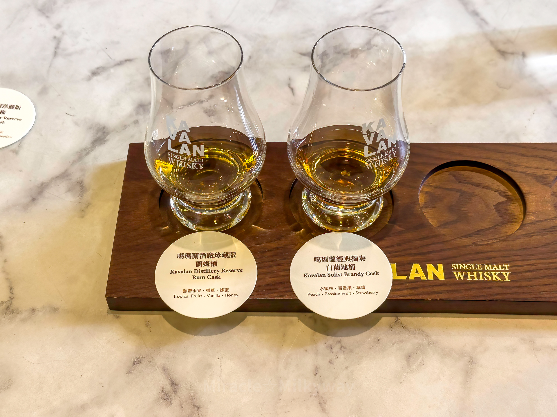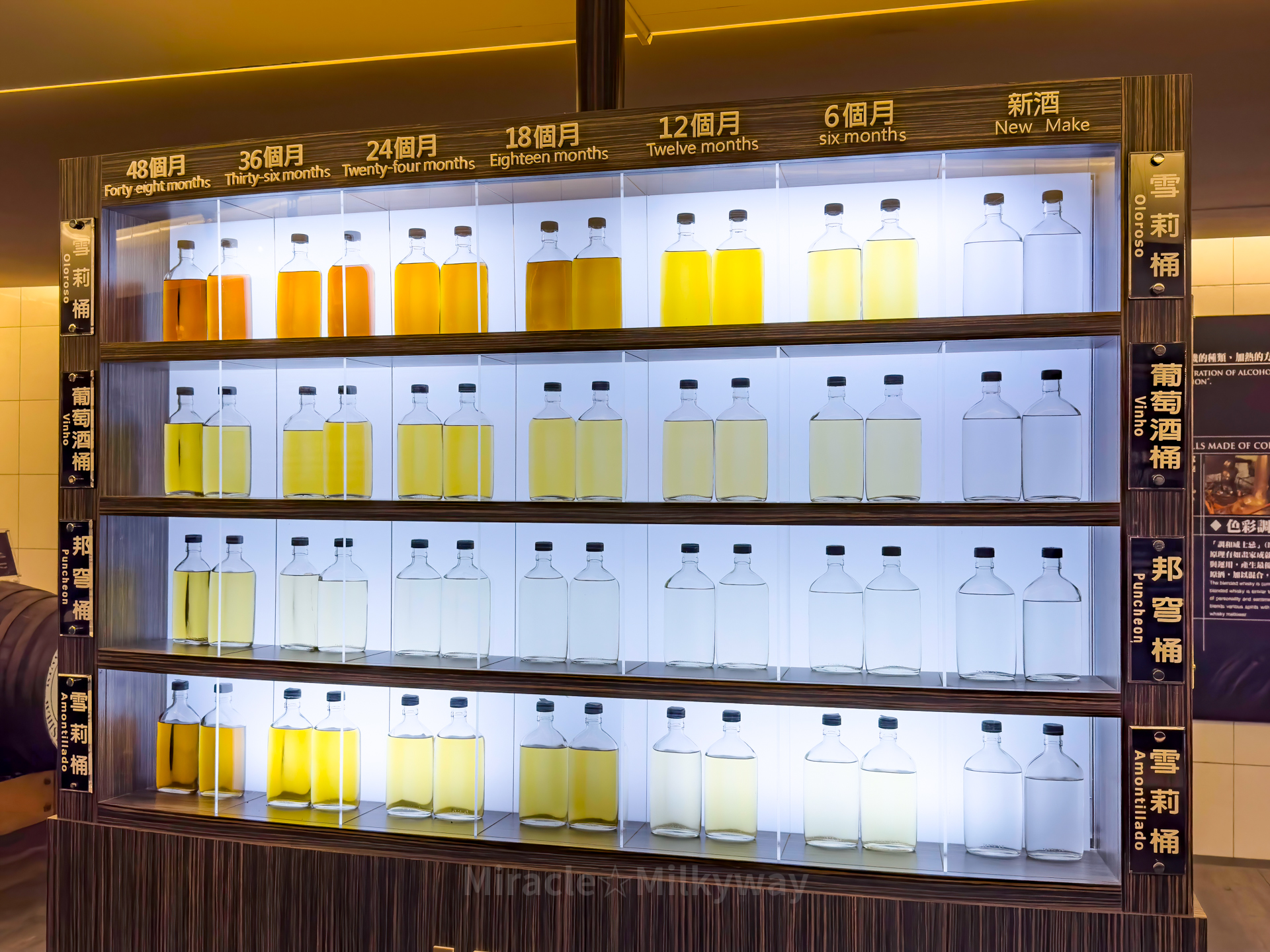 한켠에는 생산하는 제품을 종류별로 세워 놓았다. 카발란 숙성 창고의 오크통들이 전부 서 있는 이유는 대만, 그 중에서도 동부 해안에는 지진이 많아서 굴러가지 않게 하기 위함이라고.