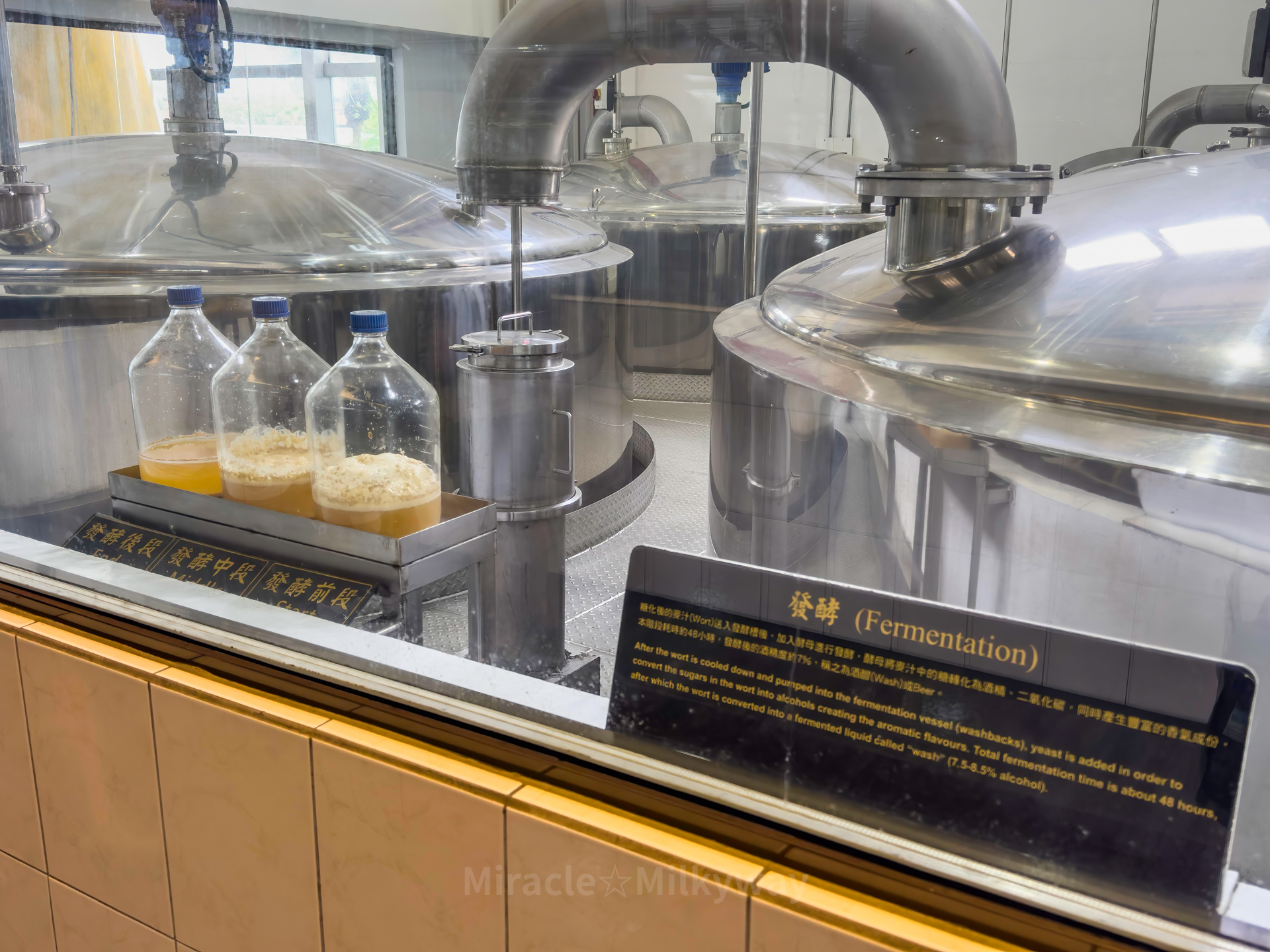 발효 공정. 왼쪽에 보이는 통들이 오른쪽부터 발효 전, 중, 후의 상태다