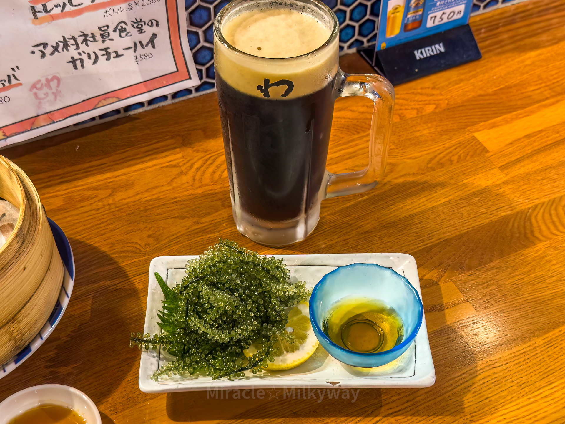 첫 메뉴는 호르몬 매운 미소 볶음. 만두는 고기, 새우, 풋고추 각 1종으로 엄청 맛있었다. 그리고 기왕 오키나와에 왔으니 바다포도를 먹어보는데 보이는대로 그냥 흔한 해조류 맛이다. 그리고 참치 또한 흔한 참치의 맛이었다.