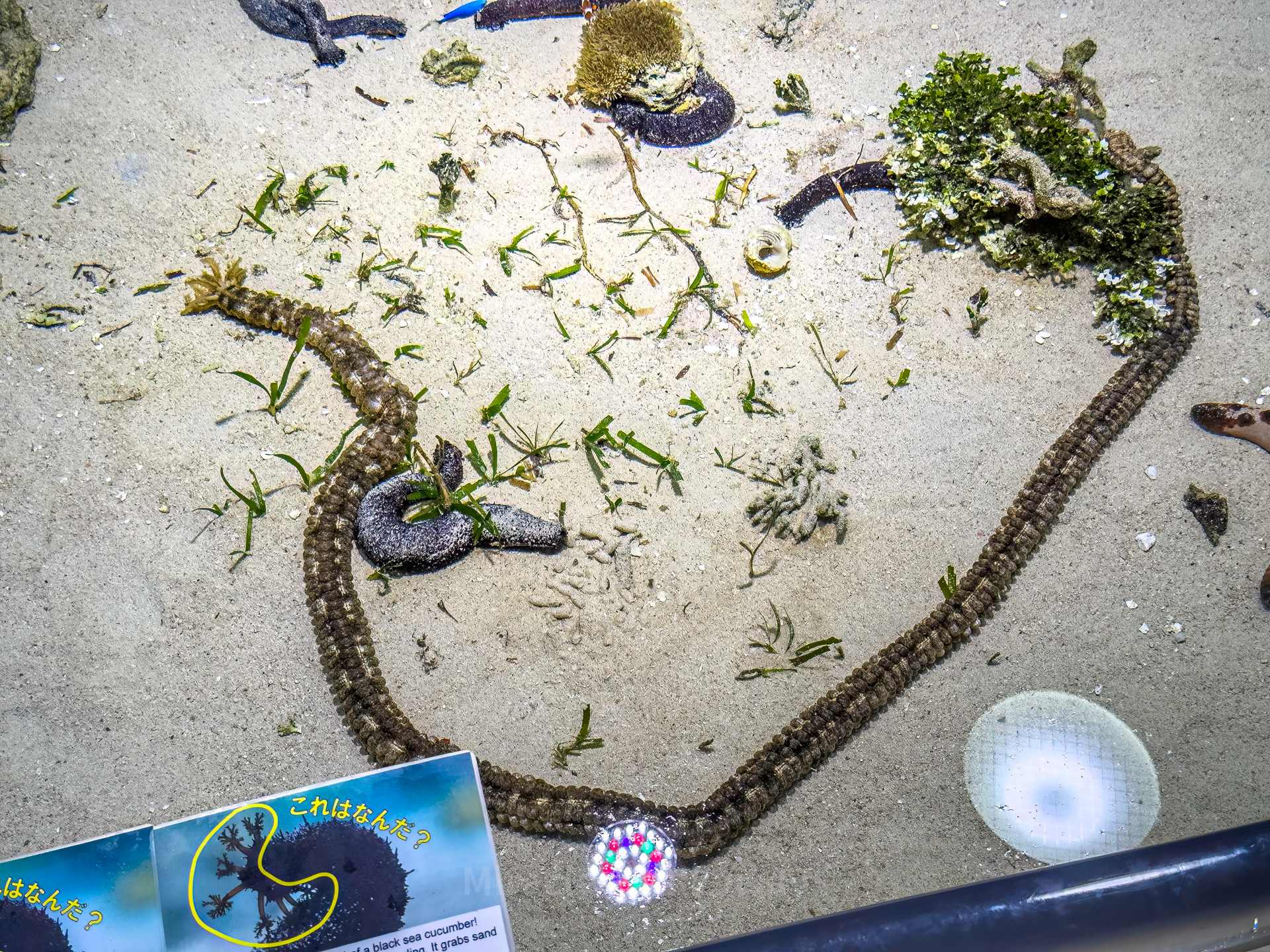 첫 사진 가운데의 주황색 불가사리는 '초콜릿 불가사리[각주:1]'라는 모양이다. 두 번째 사진에서 마치 하트 모양으로 몸을 늘어뜨린 녀석은 의외로 '점줄무늬끈벌레해삼[각주:2]'이라는 해삼이라고 한다.