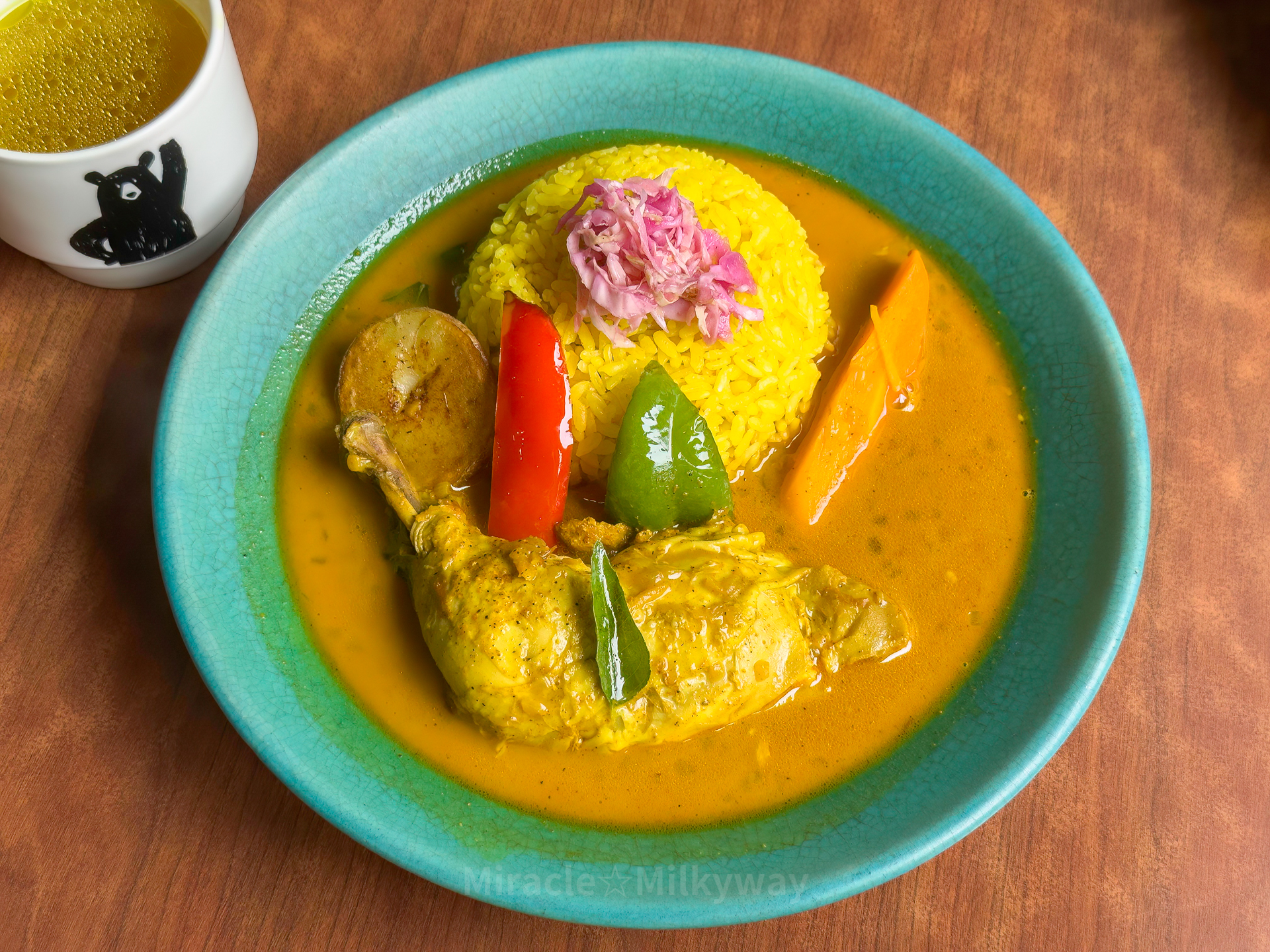 반쯤 스프커리처럼 묽은 커리에 두툼한 닭다리를 얹어주는 메뉴. 밥에도 강황을 넣어 지은 듯하고 맛있었다. 한켠에는 약간의 감칠맛이 도는 묽은 스프 냄비가 있어서 원하는 대로 떠먹을 수 있었다.