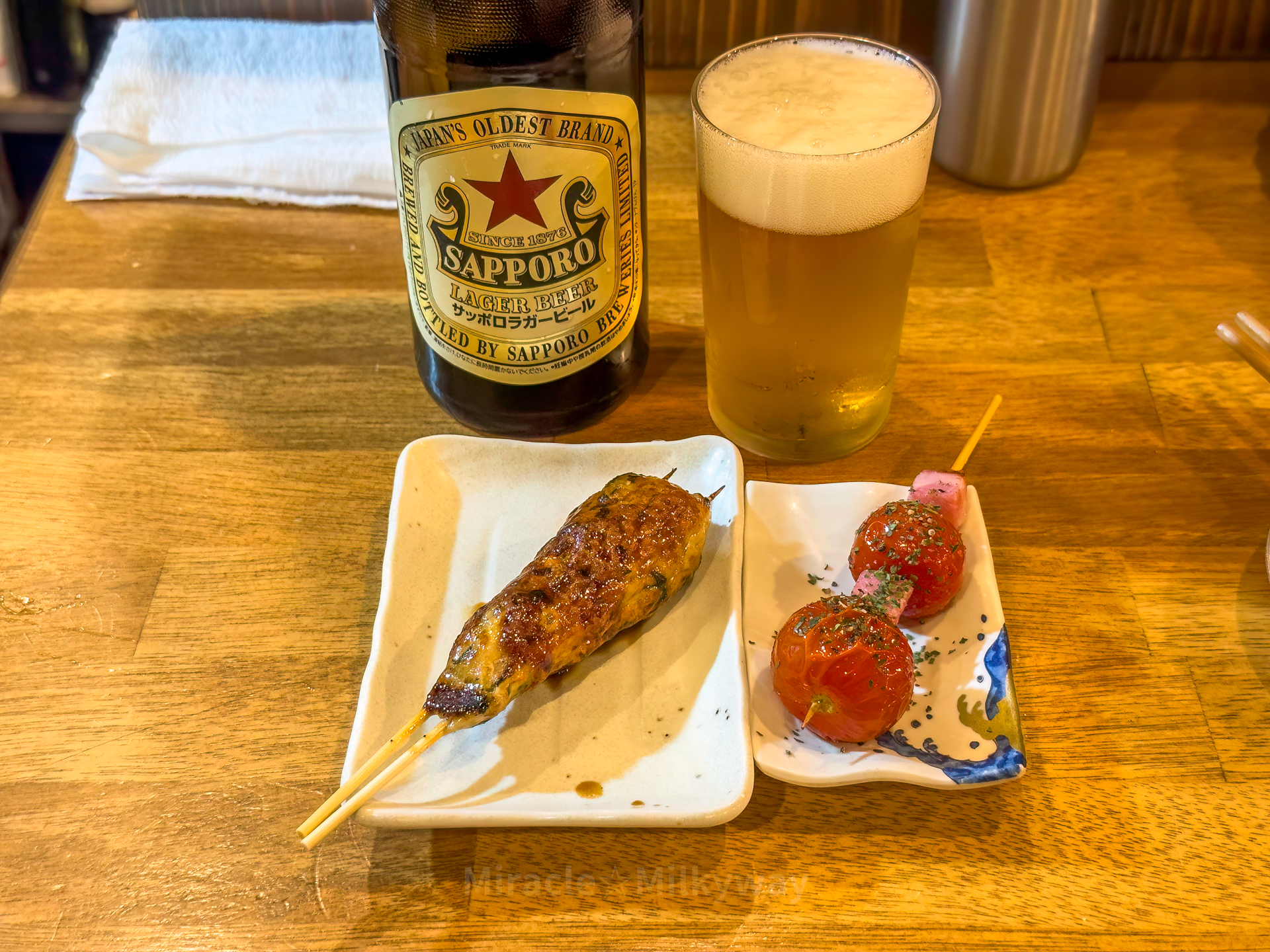 2차로는 호텔 근처의 꼬치구이 이자카야 '다다다(串焼き だだだ)'에서 삿포로 병맥주와 함께.