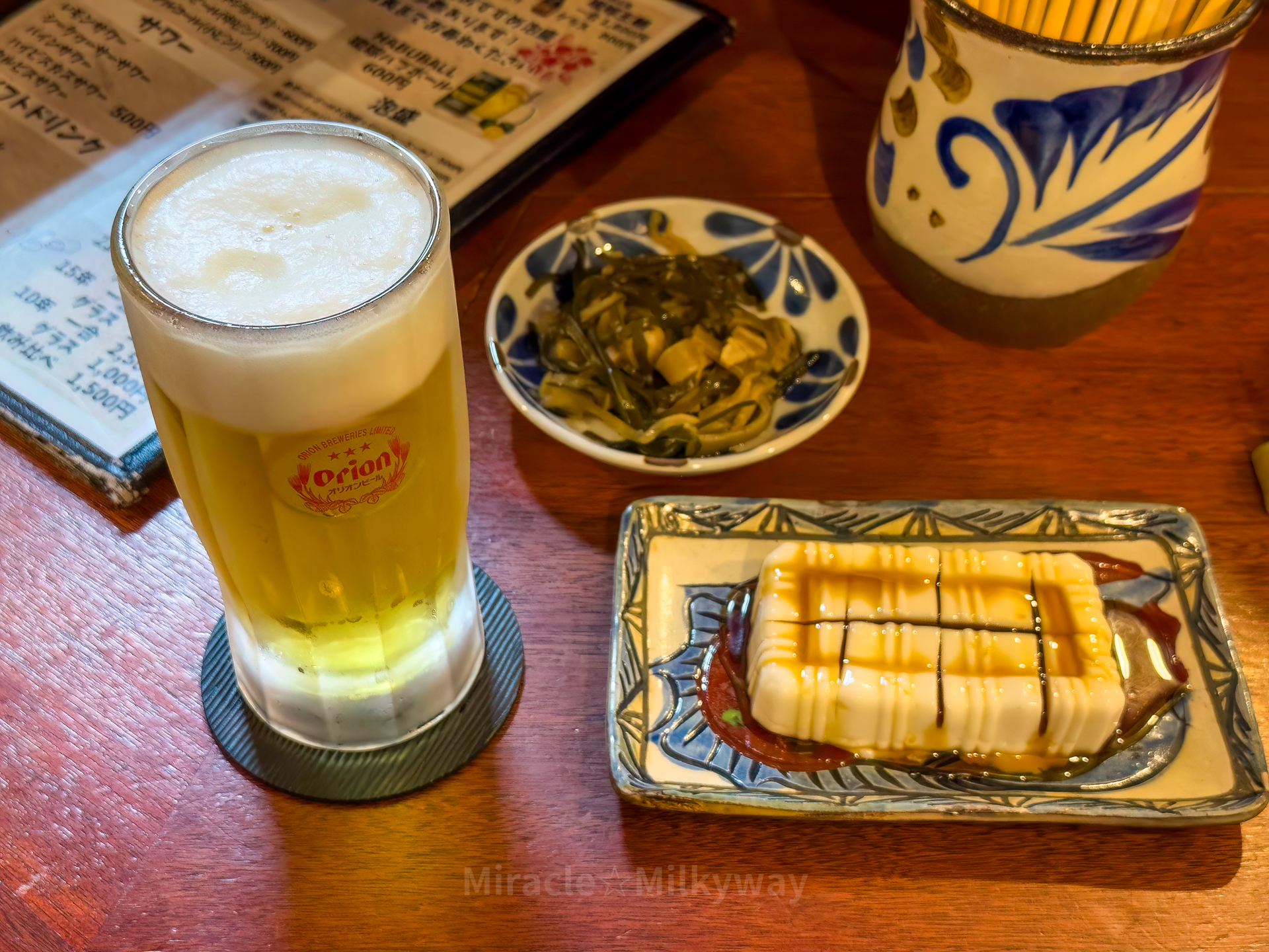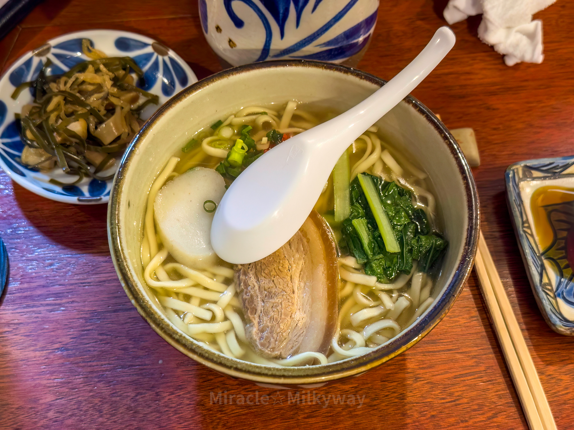 오리온 생맥주와 지마미 두부(땅콩두부)로 시작. 순두부와는 다르게 약간 푸딩처럼 탱글쫄깃한 식감이라 꽤 맛있었다. 다음으로는 오키나와 라멘을 주문했다. 고기와 함께 동그란 어묵같은 덩어리가 들어있고, 슴슴하니 따듯한 평양냉면 같은 느낌.