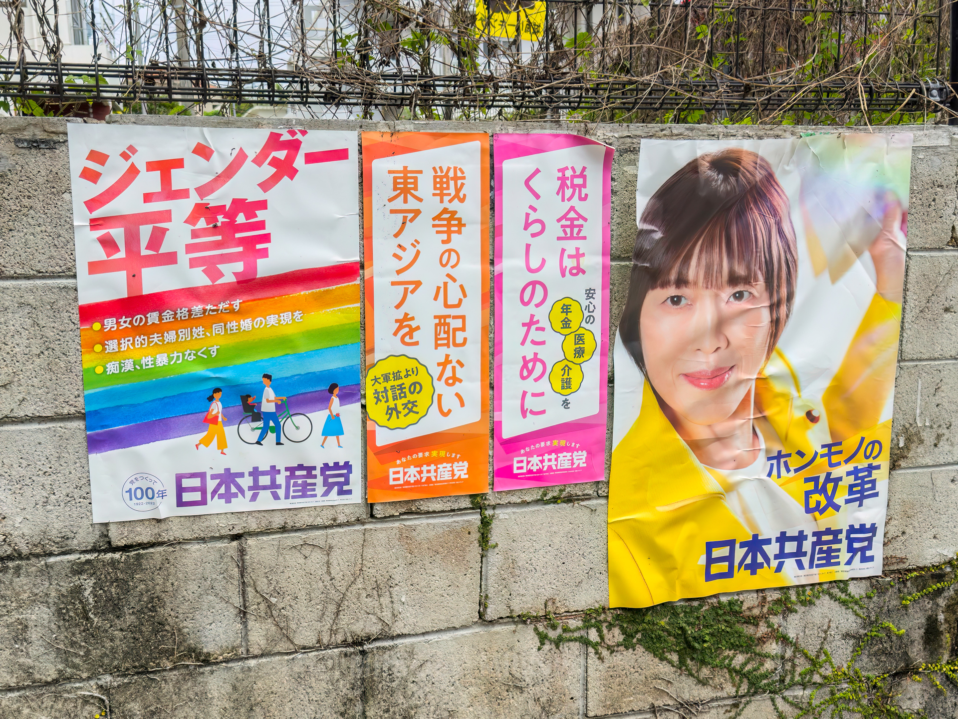 왼쪽부터 눈에 띄는 '젠더평등' 포스터. 성별 임금 격차 타파, 부부 별성[각주:4], 동성혼 실현, 치한/성폭력 감소 등. 그리고 가운데의 두 색은 각각 '전쟁 걱정 없는 동아시아를 (군비 확장보다는 대화의 외교)'와 '세금은 민생을 위해(안심할 수 있는 연금, 의료, 간호를)'라고 쓰여 있다.