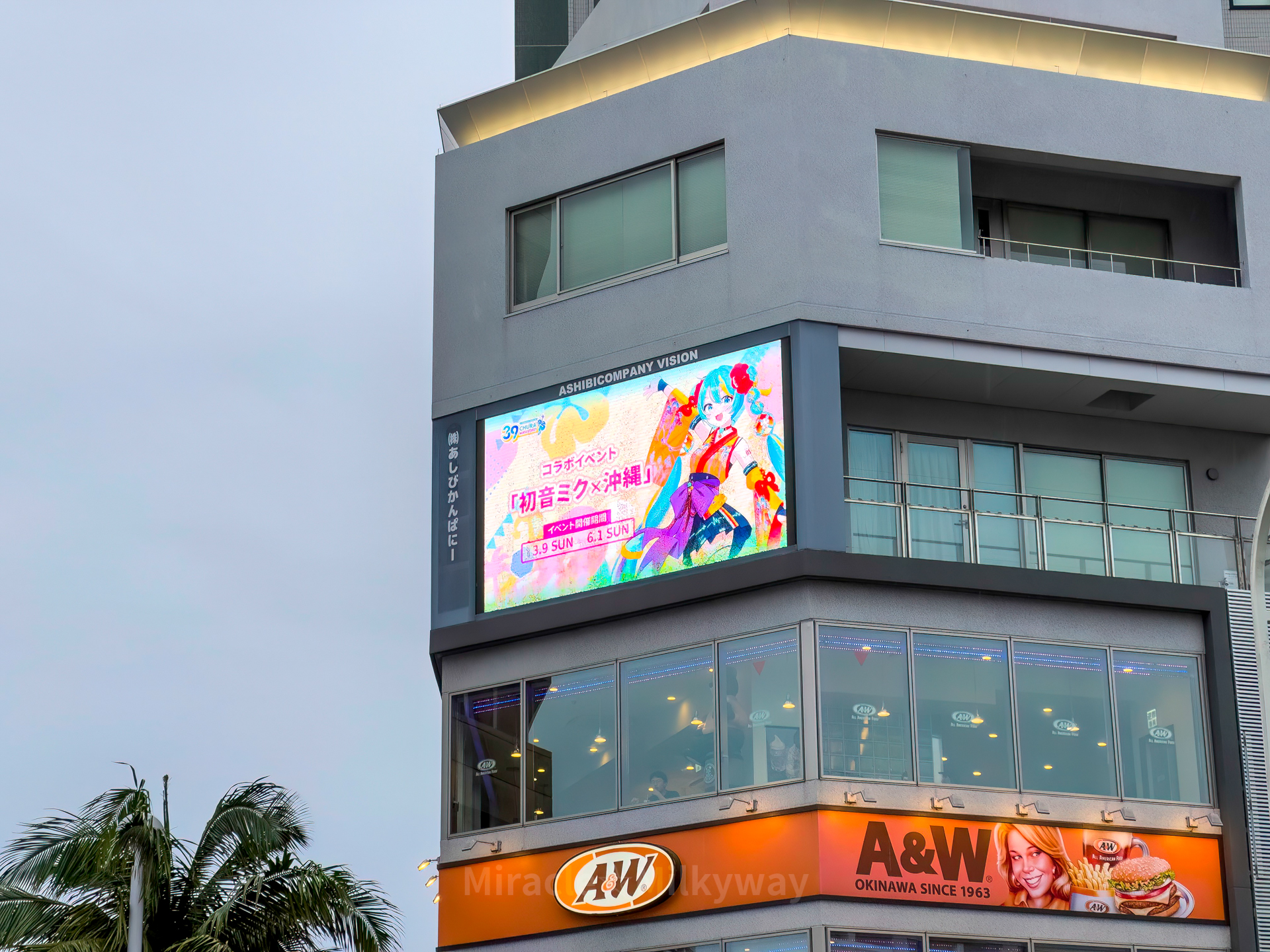 현청 앞 거리의 전광판에 미쿠와 오키나와 콜라보 이벤트 광고가 떠 있었다.