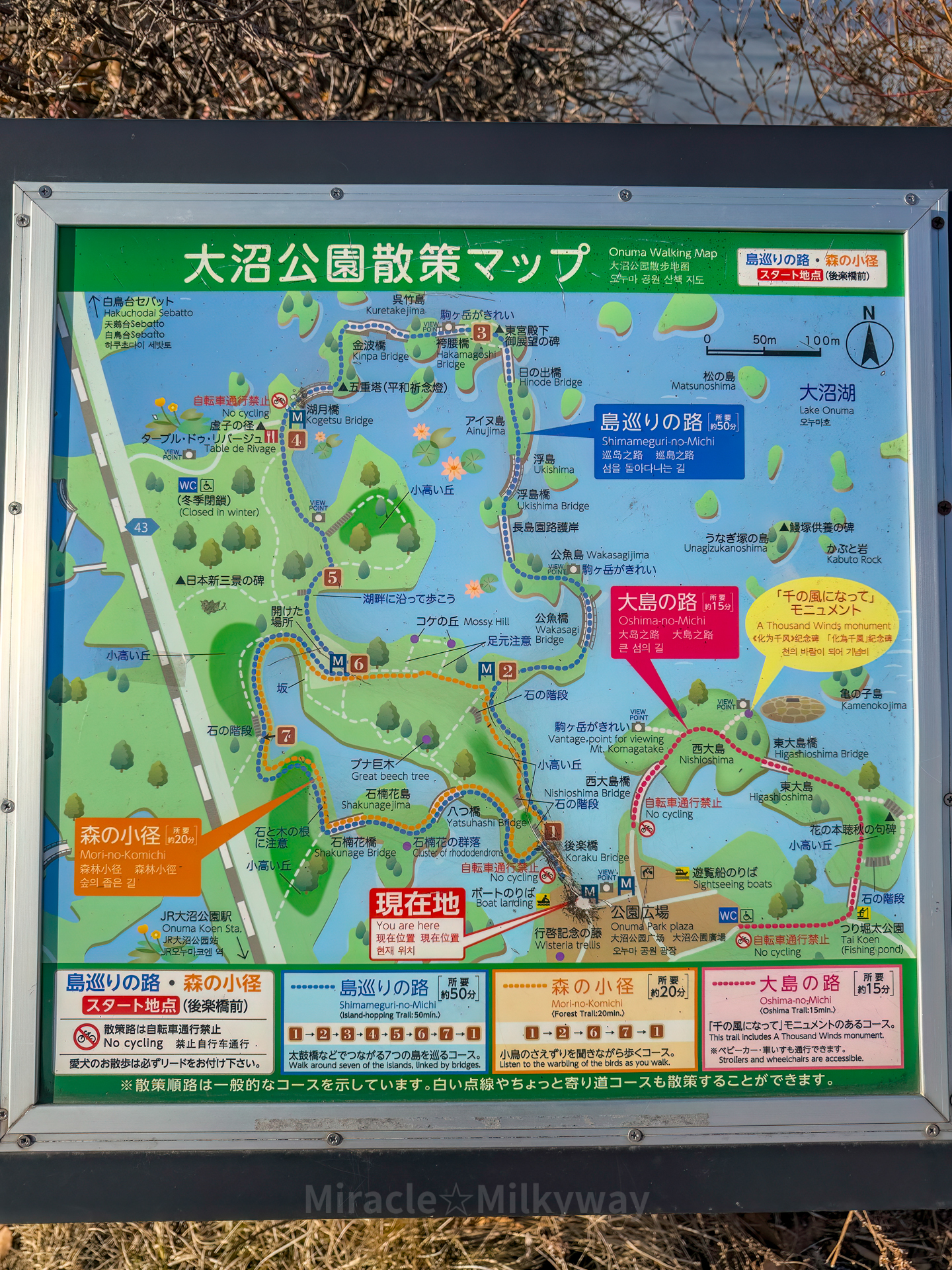 그리고 근처에 공원의 약도가 있었다. 돌아보는 코스는 파란색, 주황색, 빨간색의 총 세 가지 코스이다. 그 중 주황색은 파란색의 단축 코스이다. 일부러 다음 기차 시간을 여유롭게 잡았으니, 파란색과 빨간색 코스를 다 돌아보려 한다.