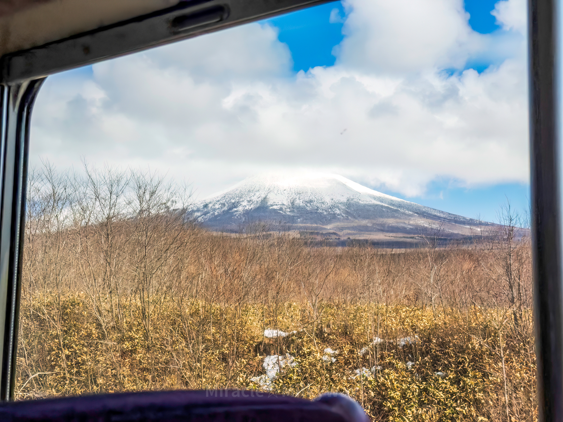 오오누마 공원 → 모리(森) 구간의 오른쪽에 보이는 높은 산, 고마가타케(駒ヶ岳) 산이다.
