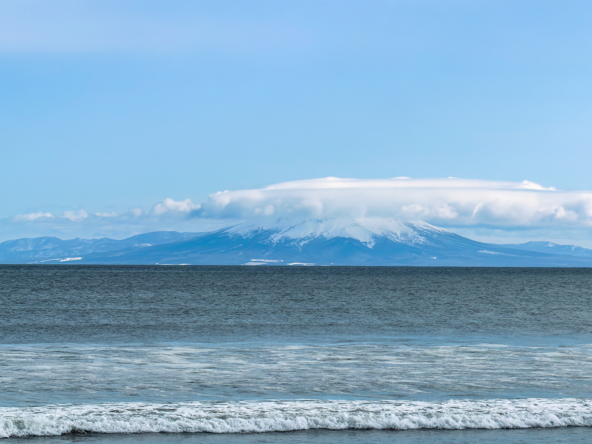 오샤만베 해안에서 바라본 구름모자 쓴 고마가타케 산