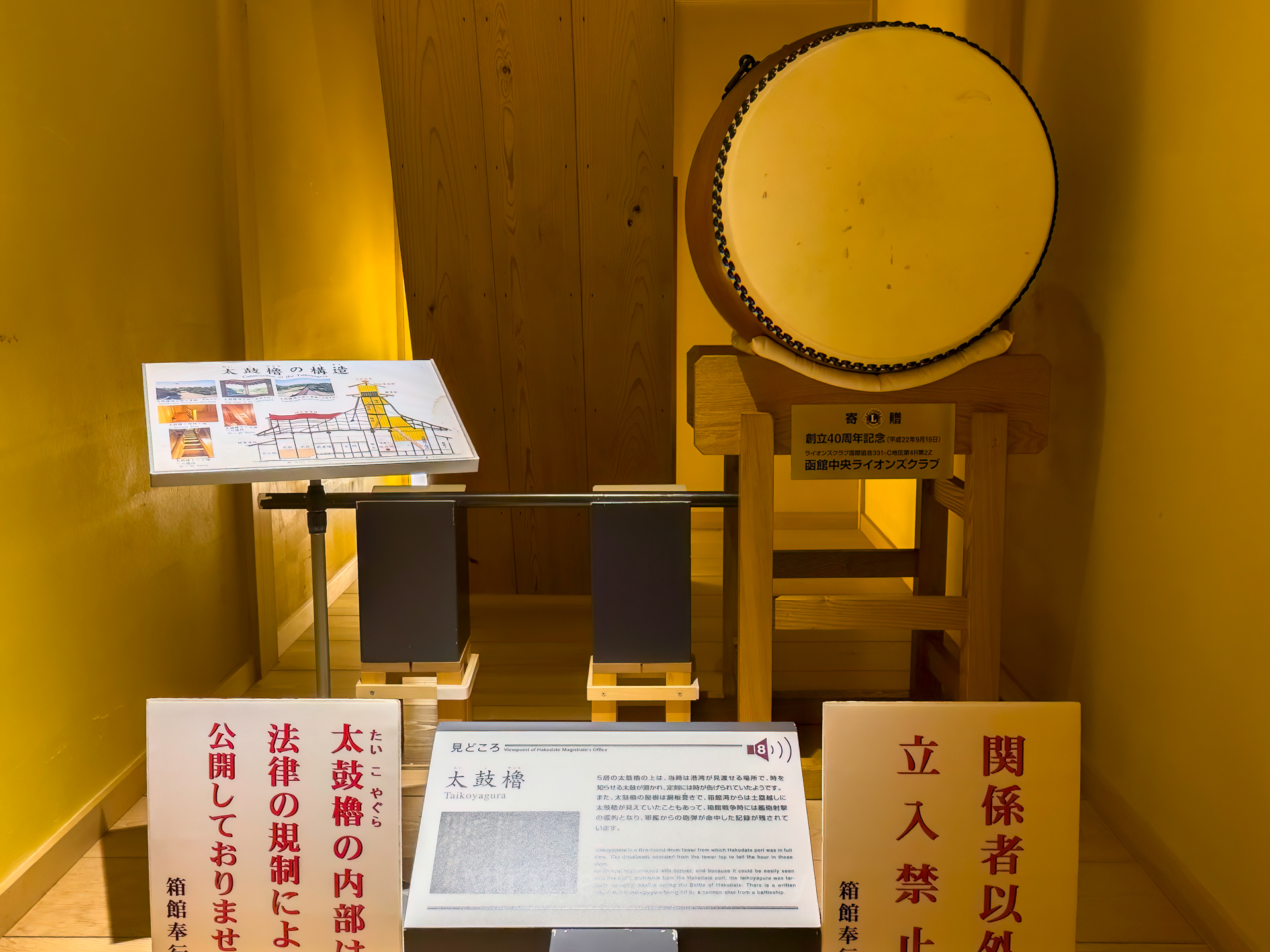 입장하는 엘리베이터 안에는 과거 에도 시대의 해군 관료였으며, 추후 메이지 시대에 북방 영토(북해도) 관련 정부 관직에서 활동한 에노모토 타케아키(榎本武揚)에 대한 소개와 함께 하코다테의 반도 지형이 천장에 그려져 있었다.