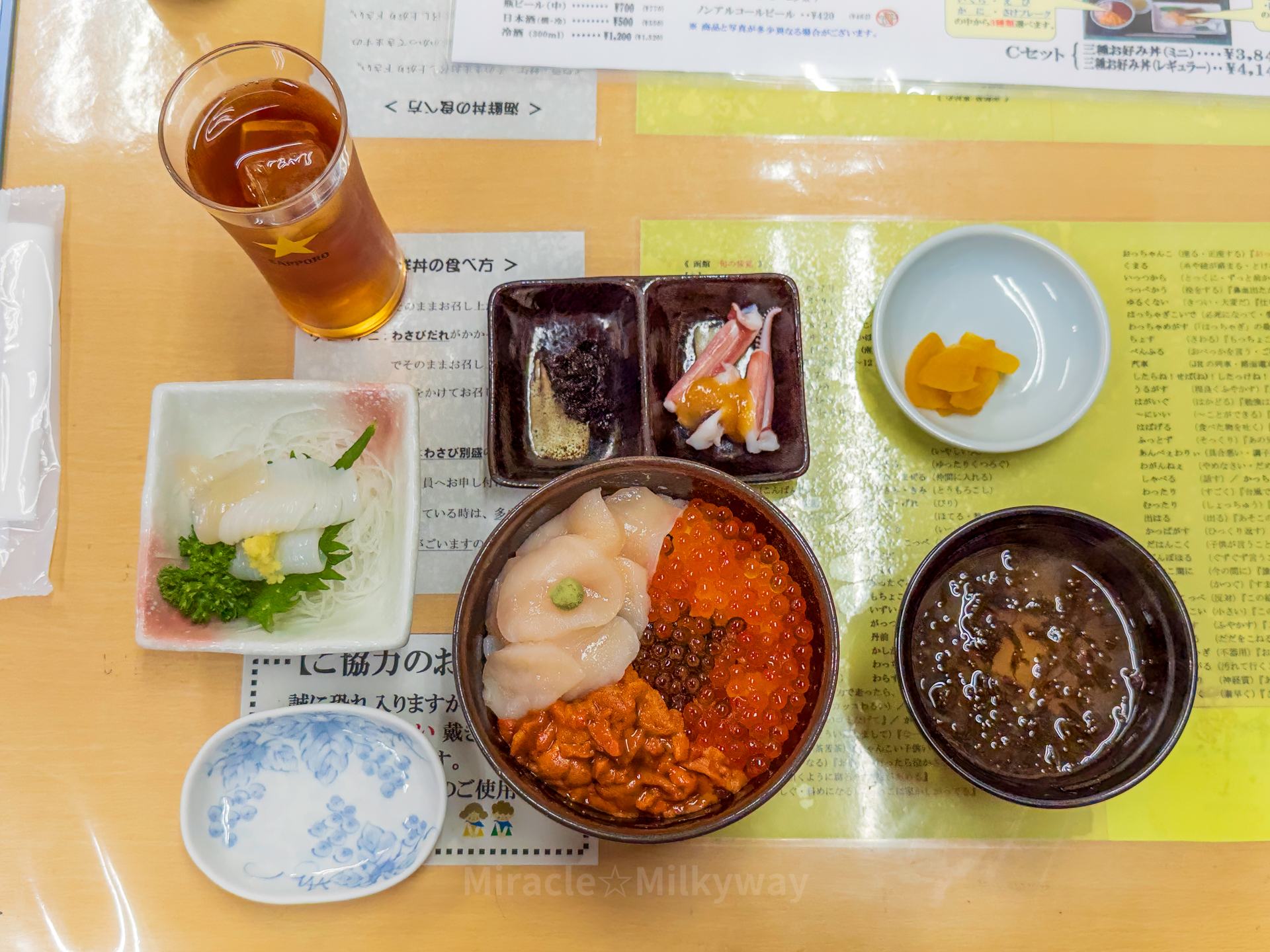 메뉴 중에서 덮밥 위에 올라가는 3가지 해산물을 직접 고를 수 있는 '3종 오코노미동'이 있었다. 여기에서 B 세트로 주문하면 오징어 사시미가, C 세트는 고등어 구이가 함께 나온다. 날생선이 끌리는 날이었기 때문에 오코노미동 B 세트와 우롱차를 함께 주문했다.