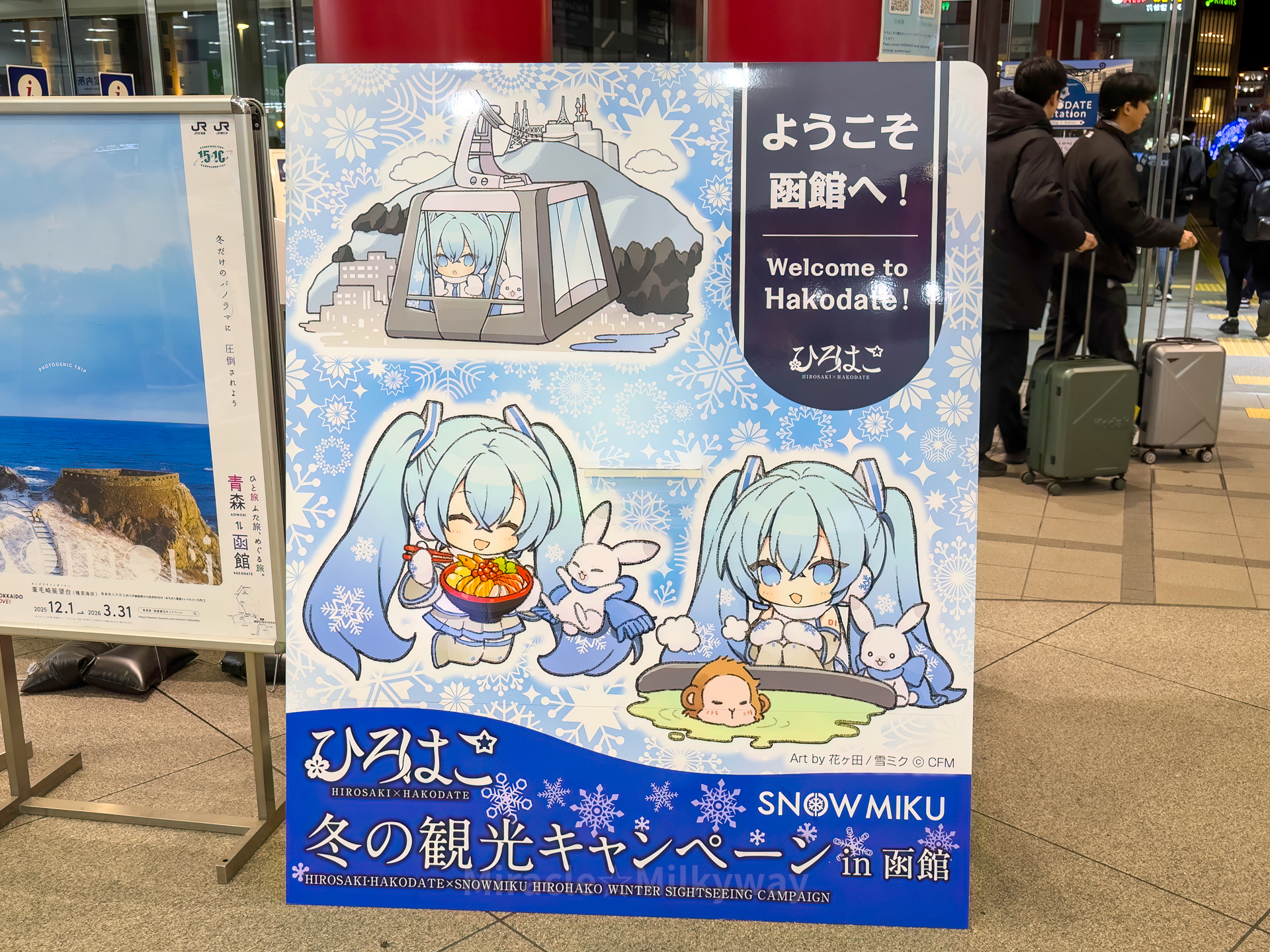 오오누마 공원에서 하코다테 역에 도착하는 새에 해가 완전히 저물어버렸다. 역에서 나가는 길에는 들어올 때 보이지 않는 방향으로 유키 미쿠가 환영하는 그림이 그려져 있다.
