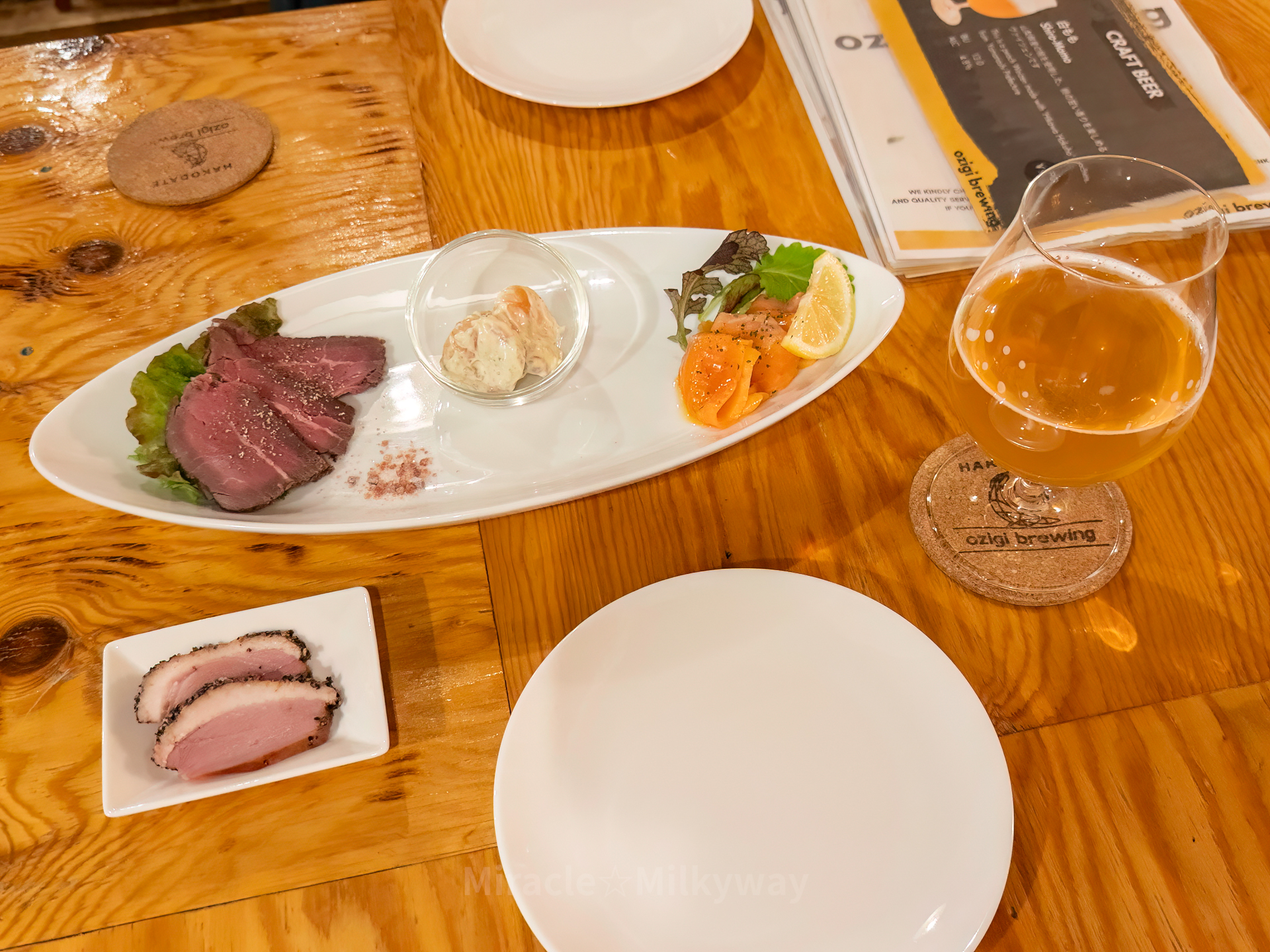 첫 안주로는 전채요리 3종을 주문했다. 훈제 연어, 튀기지 않고 삶은 듯한 크림새우, 소고기가 나온다.