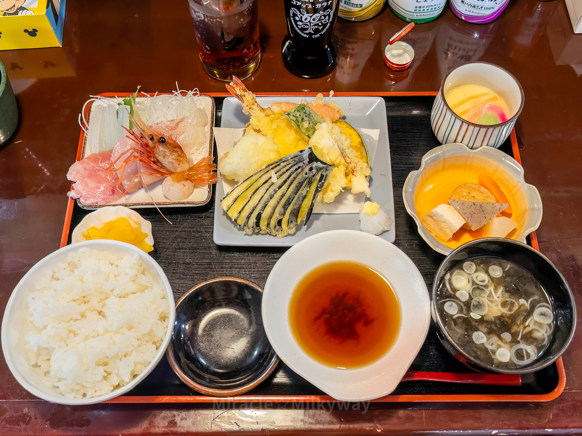 유노카와 온천 동네에 있는 '아오이 식당(葵食堂)'의 사시미 덴푸라 정식이다. 참치와 광어, 한치, 새우에 다양한 튀김과 계란찜까지 있어서 매우 듬직한 한 상이었다.