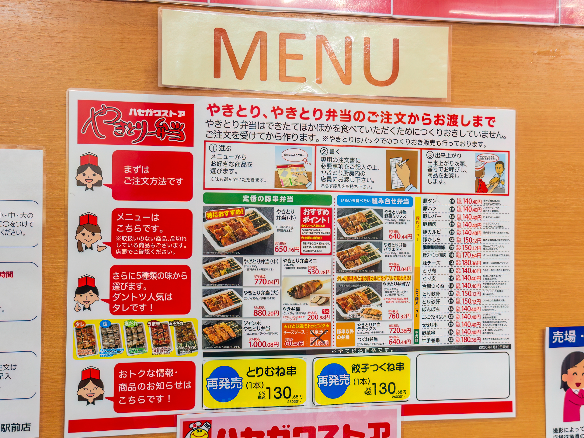 닭꼬치와 그 도시락으로 유명한 업체다. 메뉴판과, 한켠에는 재고로 남았던 닭꼬치들도 구워서 예쁘게 포장되어 있었다.