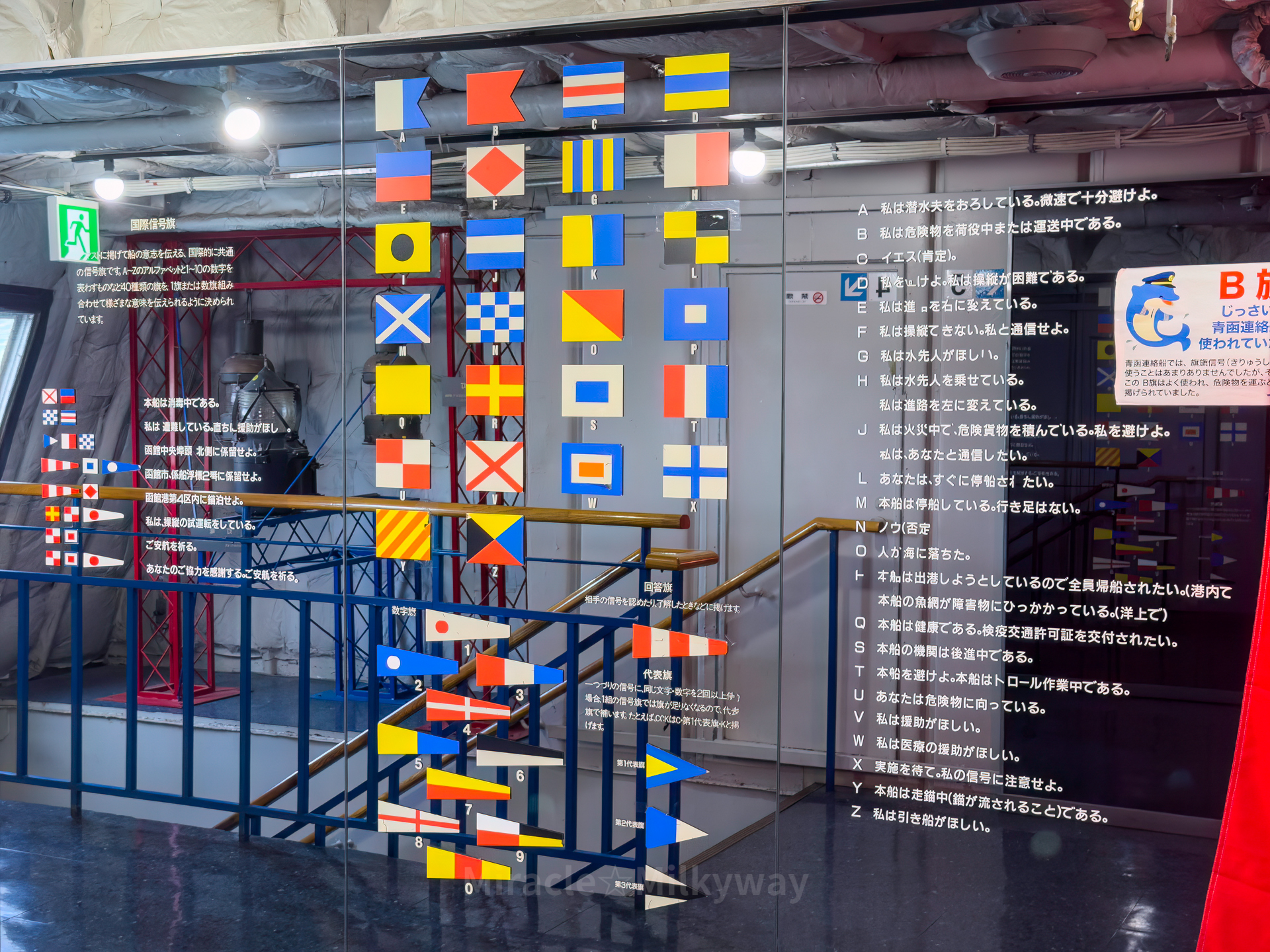 4층으로 올라가면 가장 먼저 국제신호기(国際信号旗)의 설명이 나온다. 각 알파벳 및 숫자별로 다른 문양과 형태의 깃발로, 오른쪽에 쓰인 각 의미는 여기에서 살펴볼 수 있다.