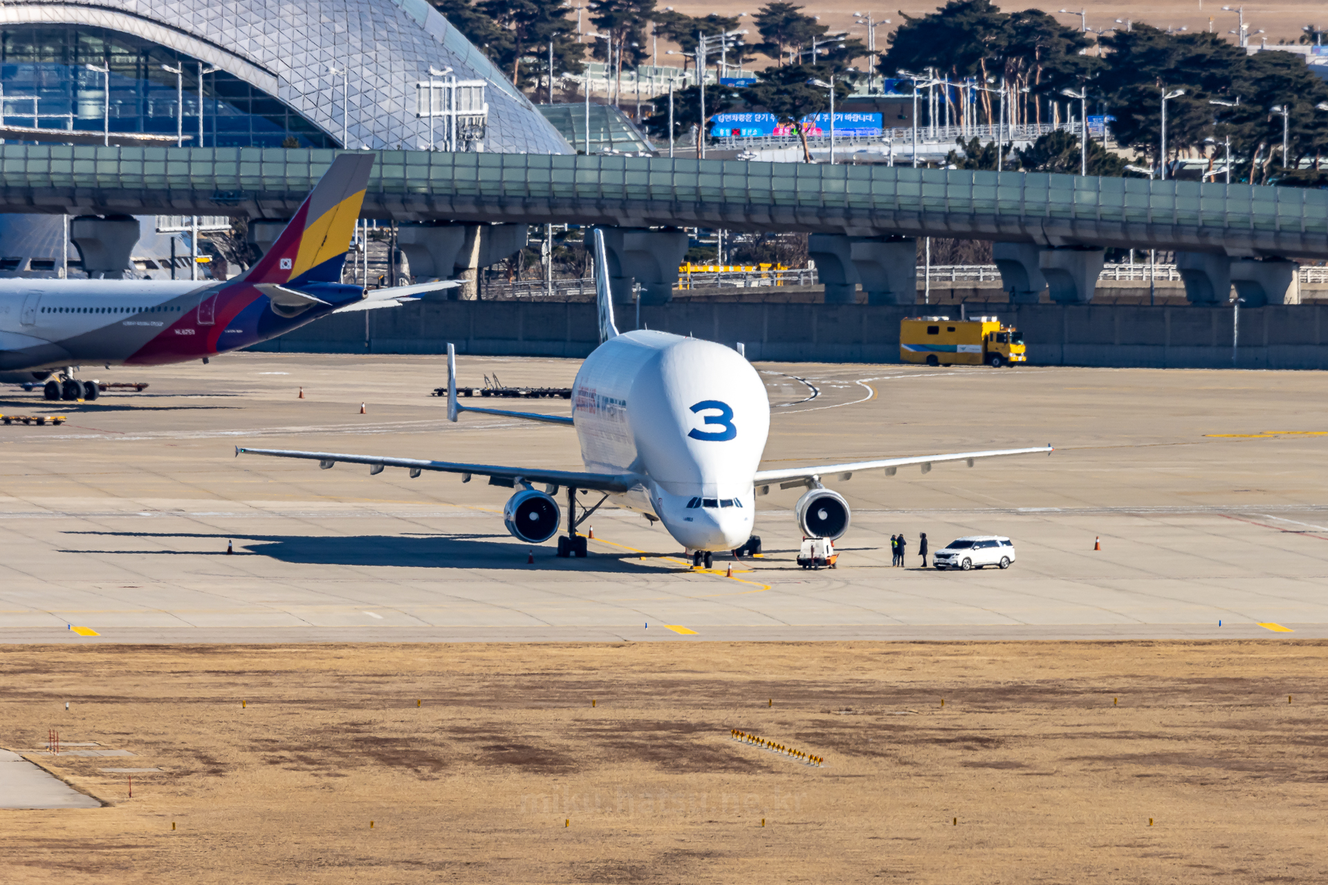 마침 벨루가를 배경으로 착륙하는 아시아나 A330.